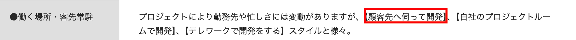 客先常駐の有無 | あいまいに書かれることが多い | 実際の割合や事例を把握 |