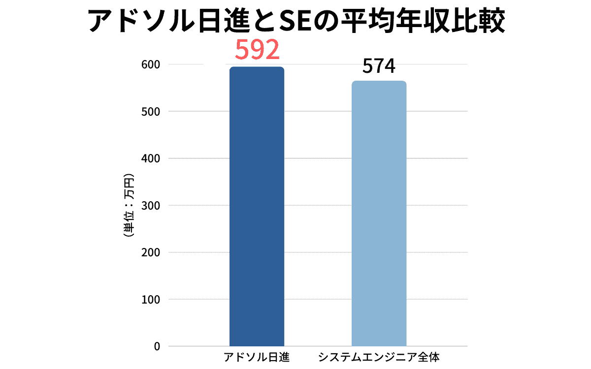 システムエンジニアの平均年収は約574万円であり、アドソル日進のほうが18万円高くなっています。