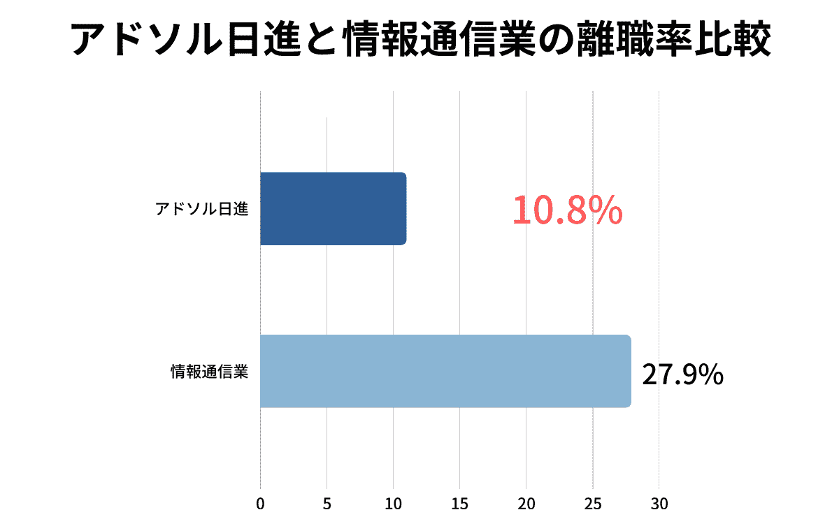 情報通信業の新卒3年以内の離職率は平均27.9%であり、アドソル日進は定着率が高いといえます。