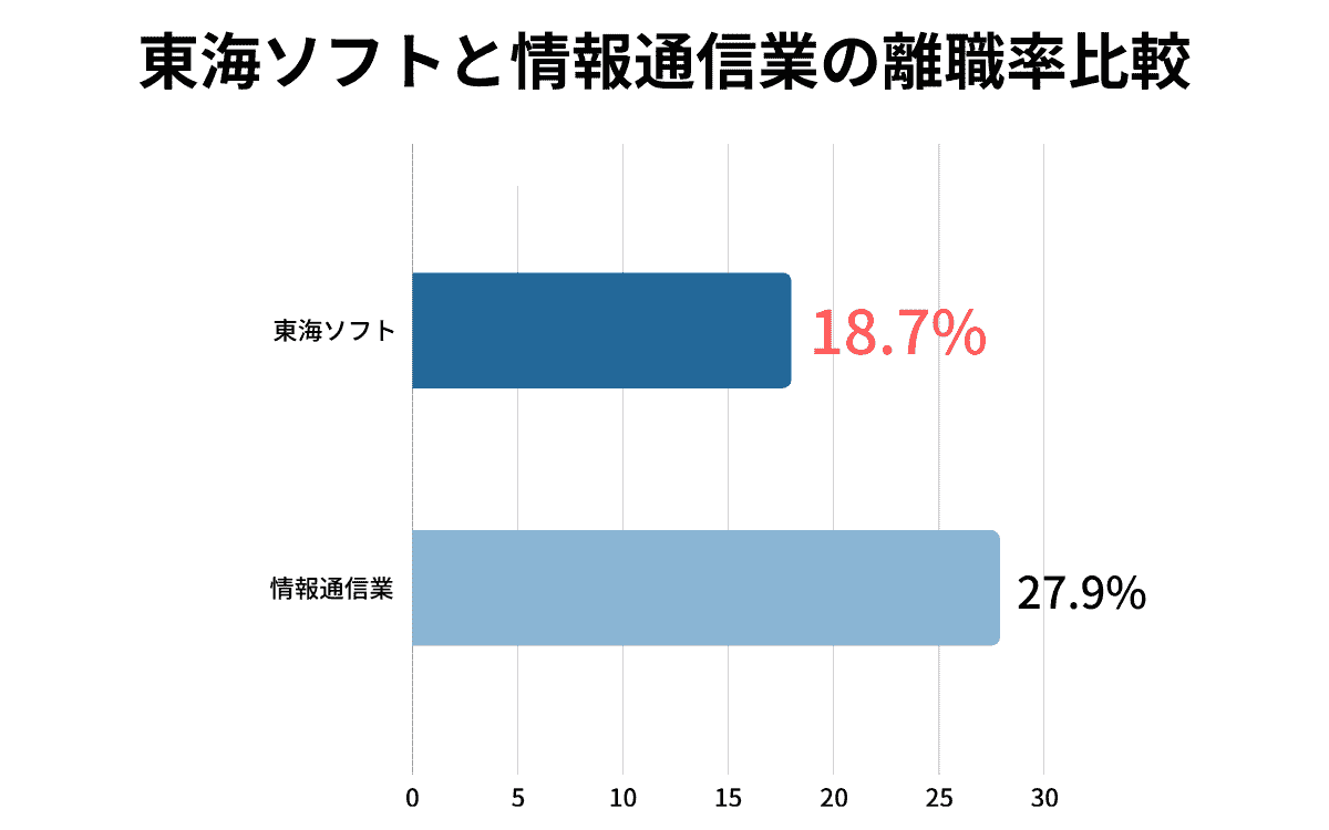 情報通信業における新卒3年以内の離職率は平均27.9%で、東海ソフトは定着率が高い傾向にあります。